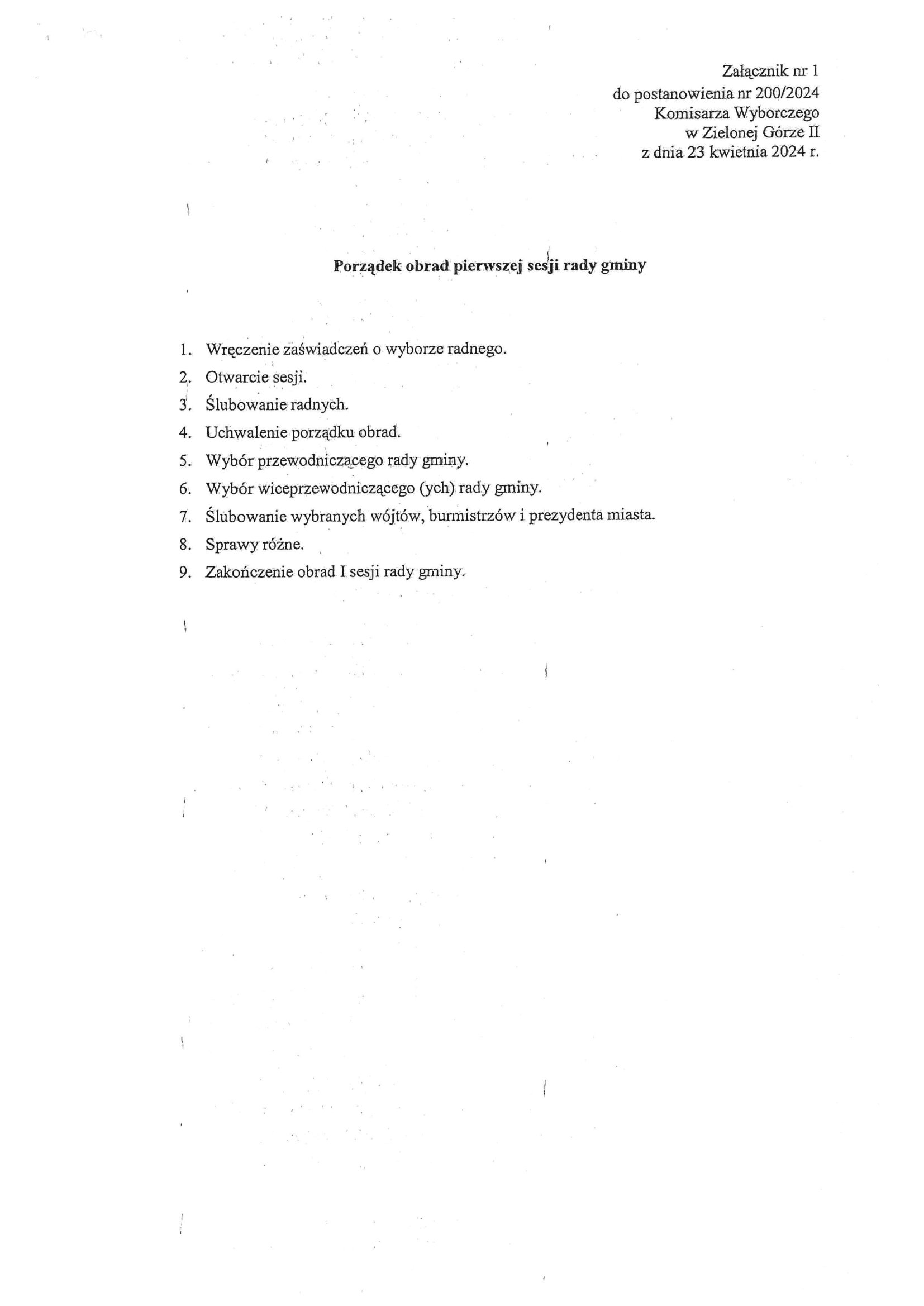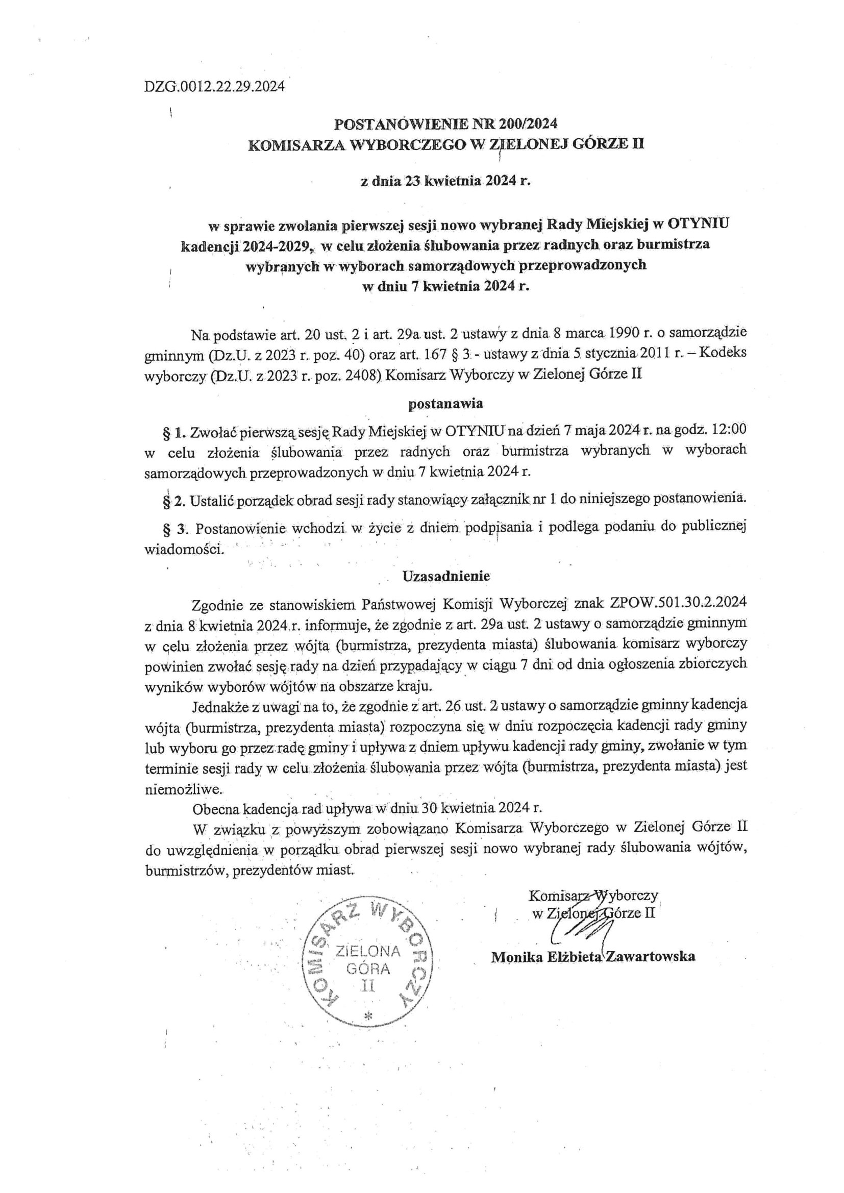 Postanowienie Komisarza Wyborczego ws. zwołania pierwszej sesji nowo wybranej Rady Miejskiej Otyń kadencji 2024-29