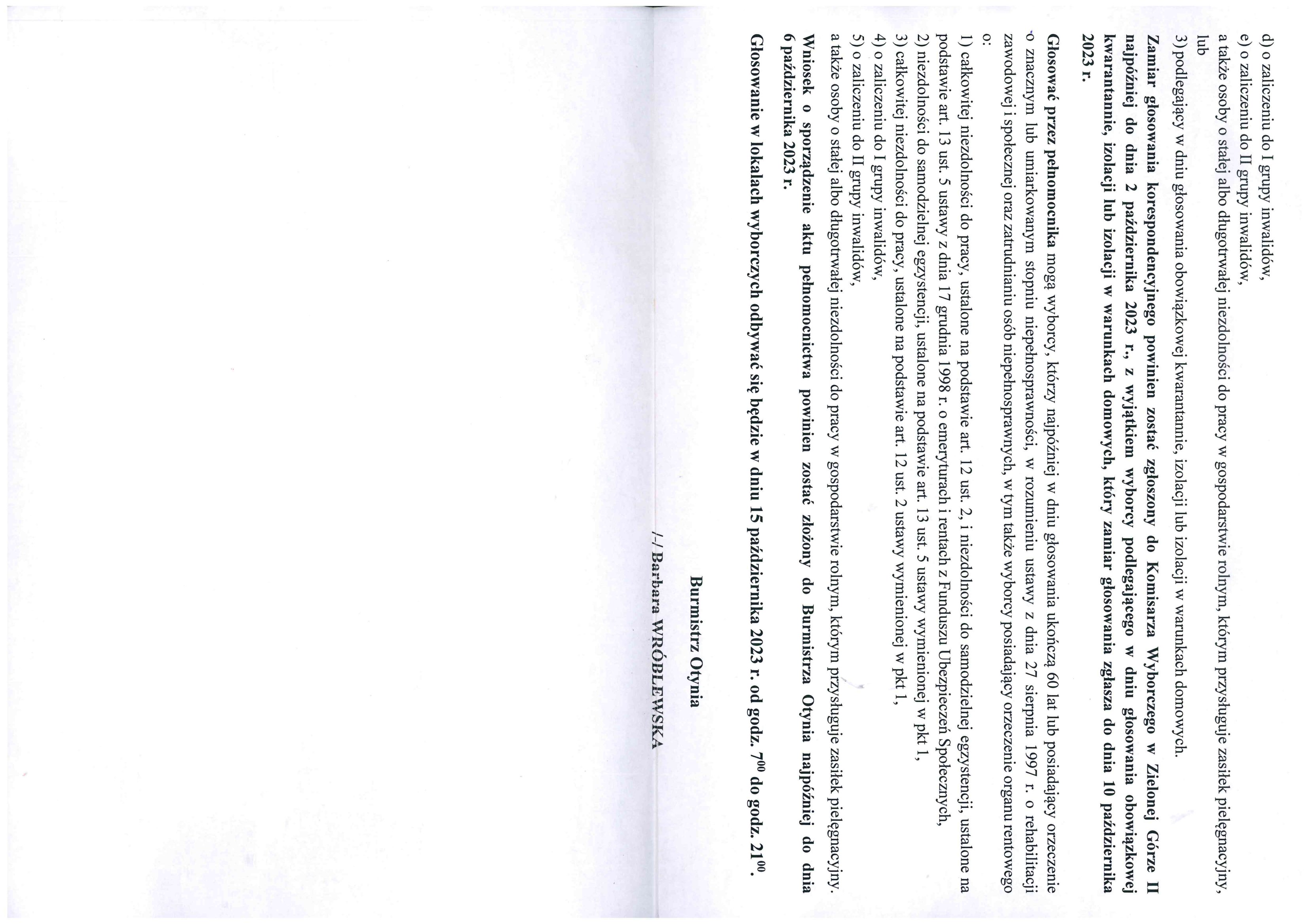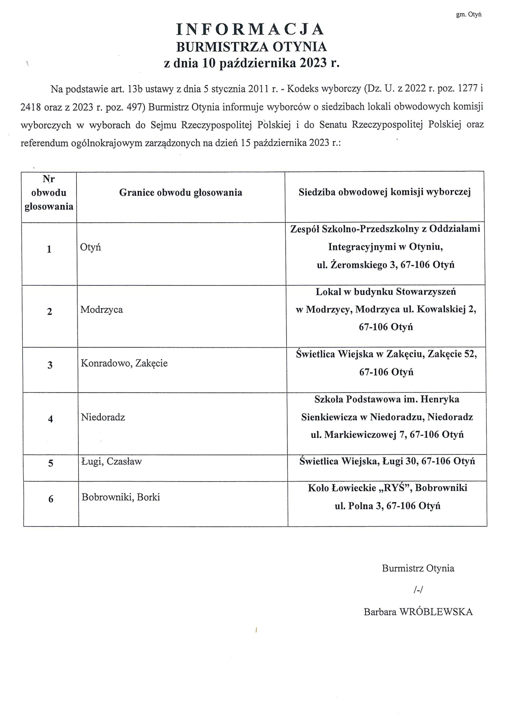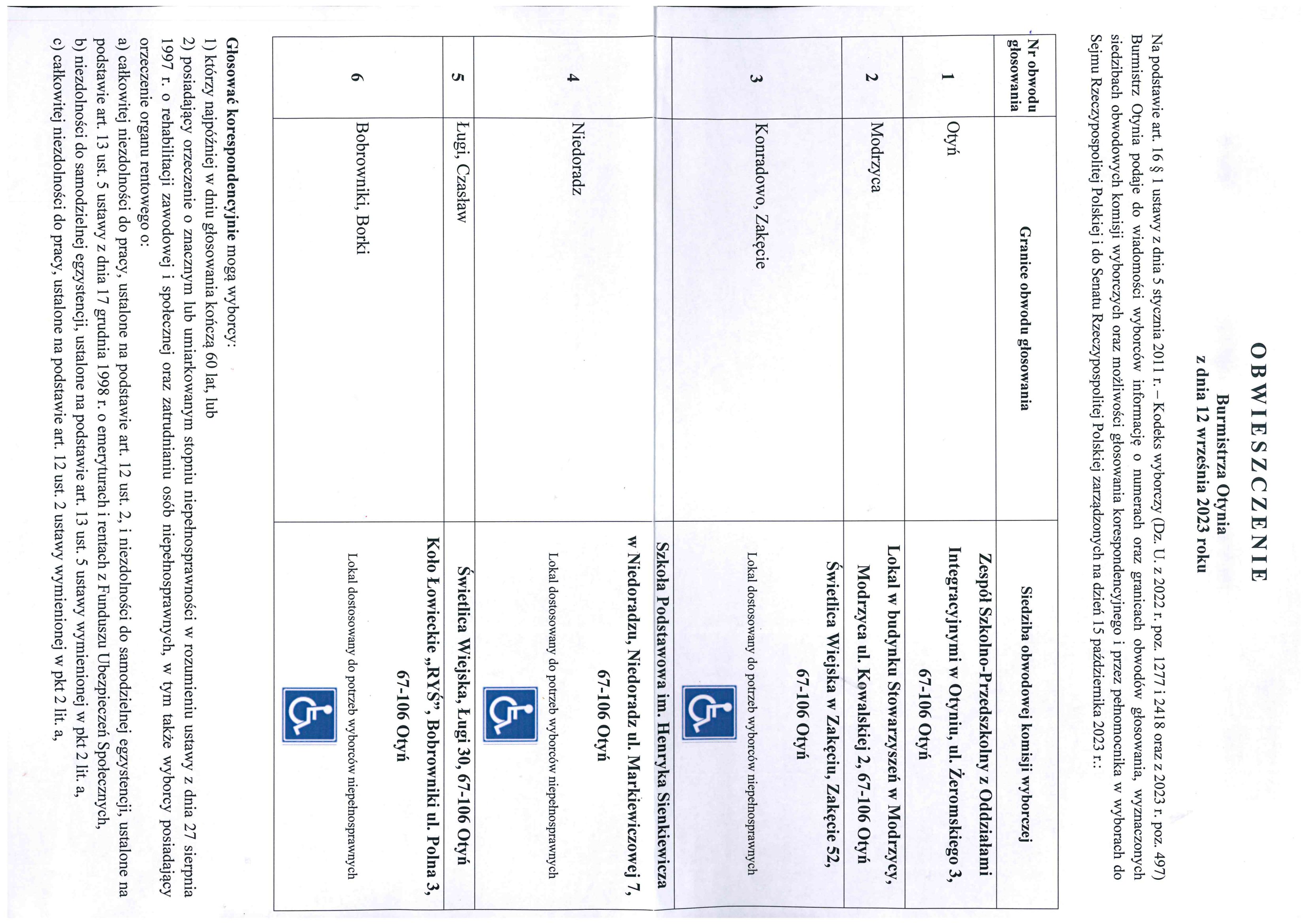 Informacja o numerach, granicach obwodów głosowania, siedzibach obwodowych komisji wyborczych, możliwości głosowania korespondencyjnego i przez pełnomocnika w wyborach do Sejmu Rzeczypospolitej Polskiej i do Senatu Rzeczypospolitej Polskiej zarządzonych na 15 października 2023 roku
