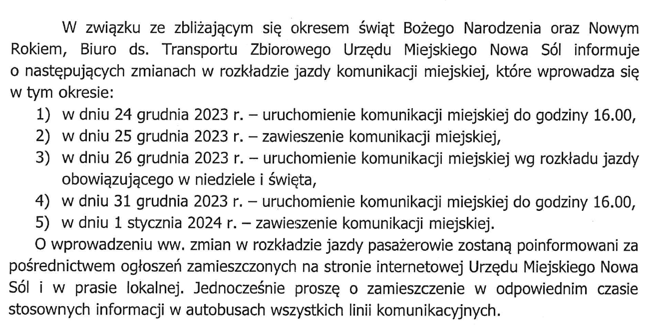 Zmiany w rozkładzie jazdy w dniach 24-26.12, 31.12 i 01.01
