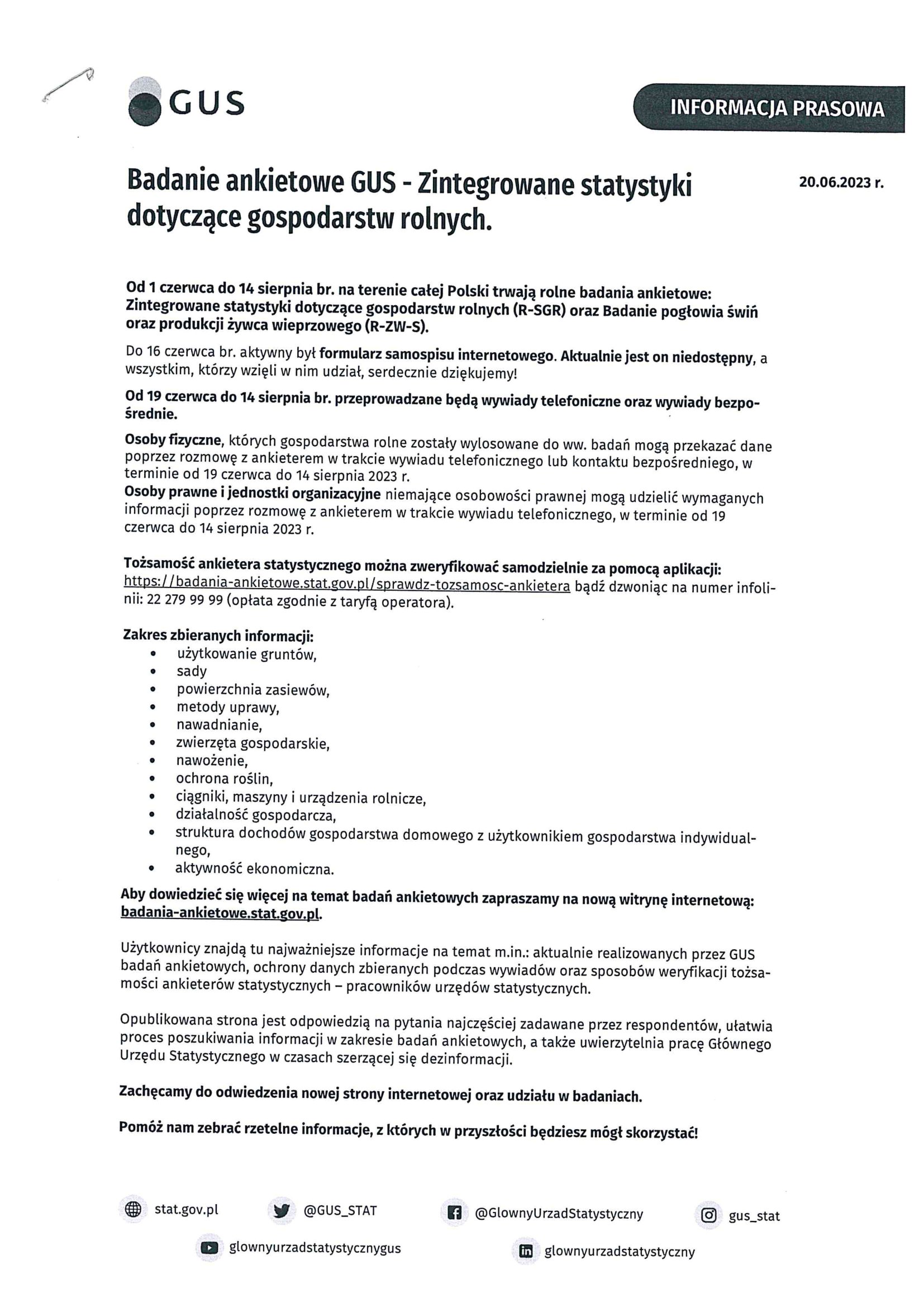 Zintegrowane statystyki dotyczące gospodarstw rolnych - ankieta GUS