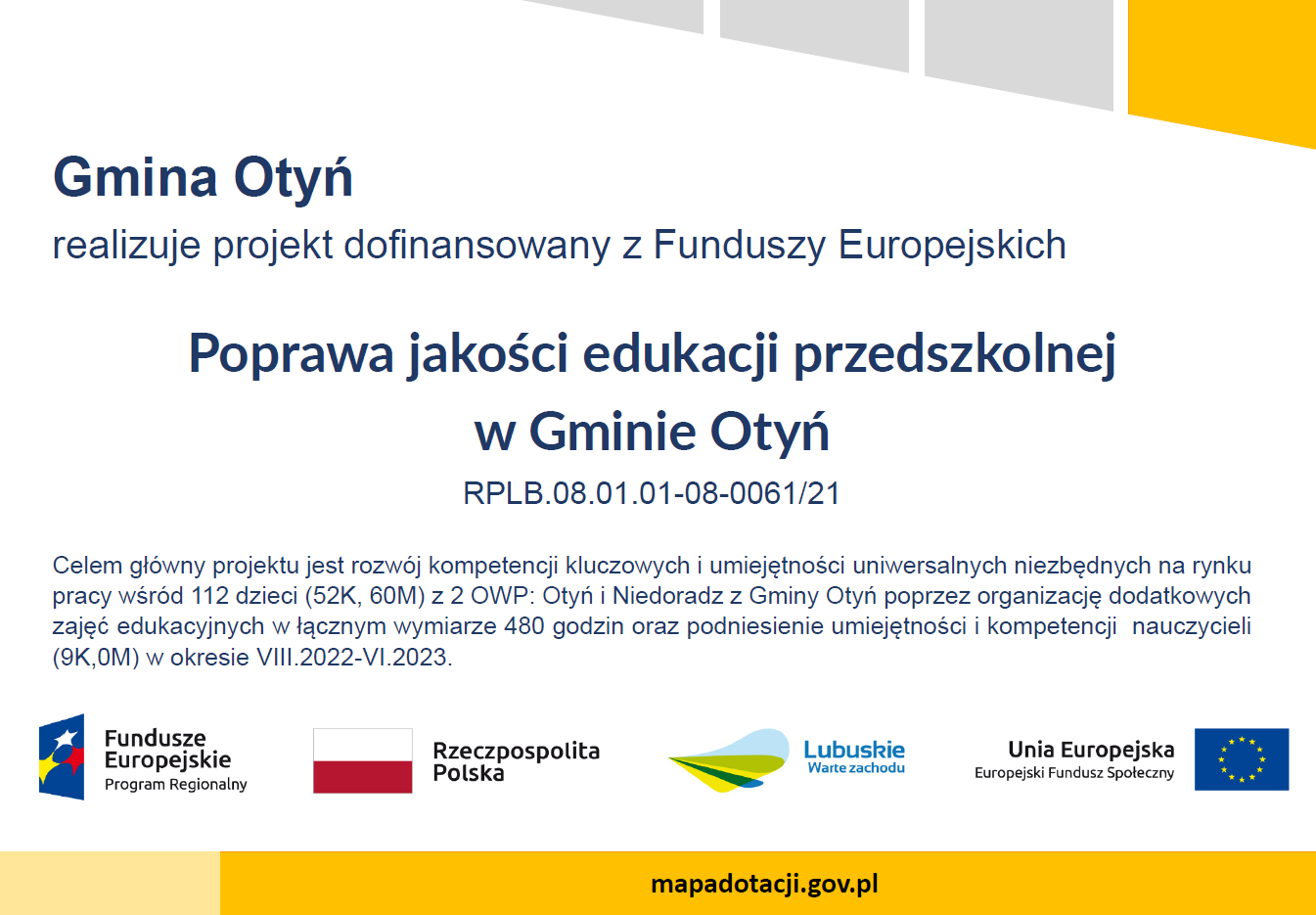 Gmina Otyń realizuje projekt dofinansowany z Funduszy Europejskich pt. Poprawa jakości edukacji przedszkolnej w Gminie Otyń (RPLB.08.01.01-08-0061/21).