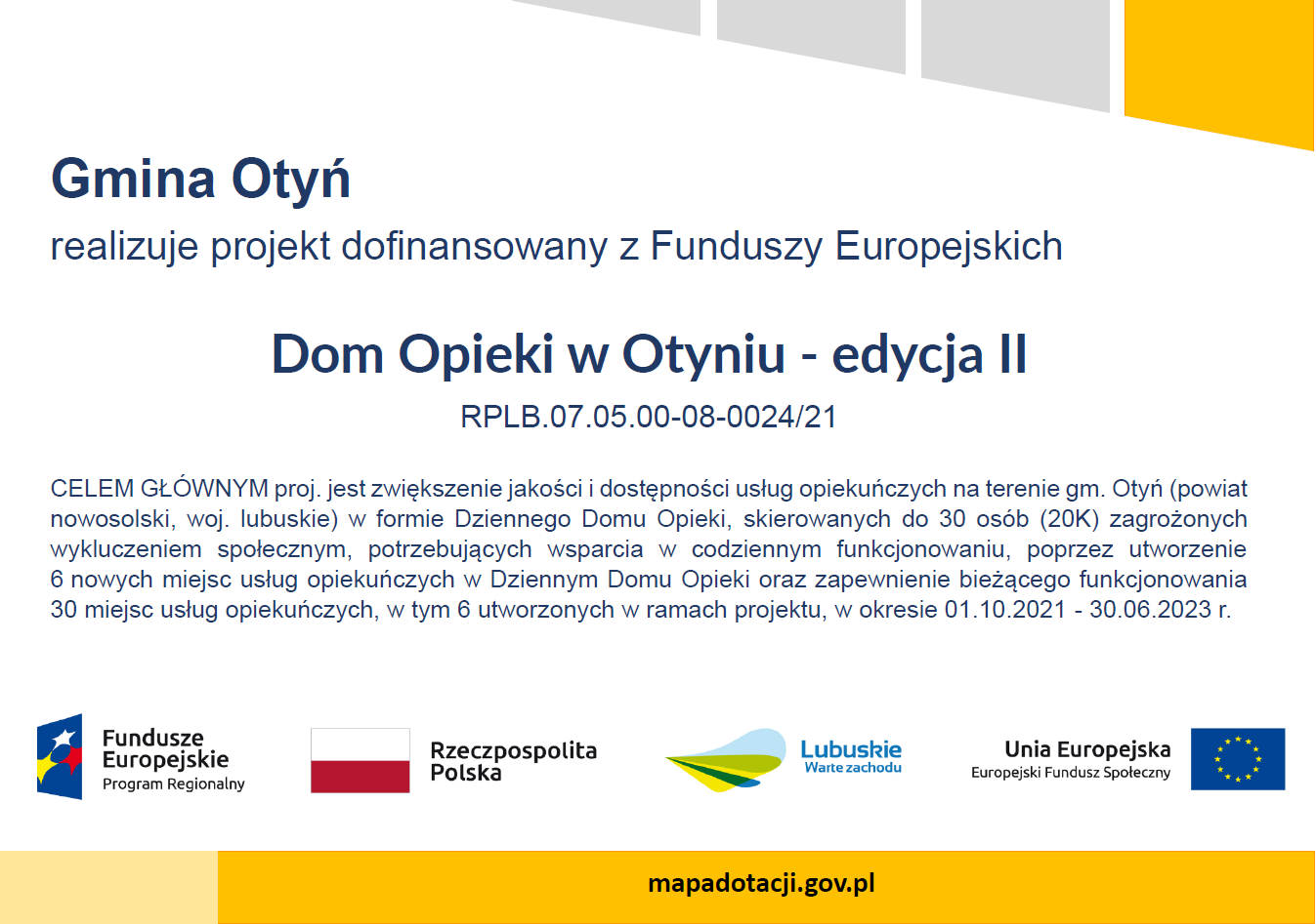 CELEM GŁÓWNYM projektu jest zwiększenie jakości i dostępności usług opiekuńczych na terenie gm. Otyń (powiat nowosolski, woj. lubuskie) w formie Dziennego Domu Opieki, skierowanych do 30 osób (20K) zagrożonych wykluczeniem społecznym, potrzebujących wsparcia w codziennym funkcjonowaniu, poprzez utworzenie 6 nowych miejsc usług opiekuńczych w Dziennym Domu Opieki oraz zapewnienie bieżącego funkcjonowania 30 miejsc usług opiekuńczych, w tym 6 utworzonych w ramach projektu, w okresie 01.10.2021 - 30.06.2023 r.