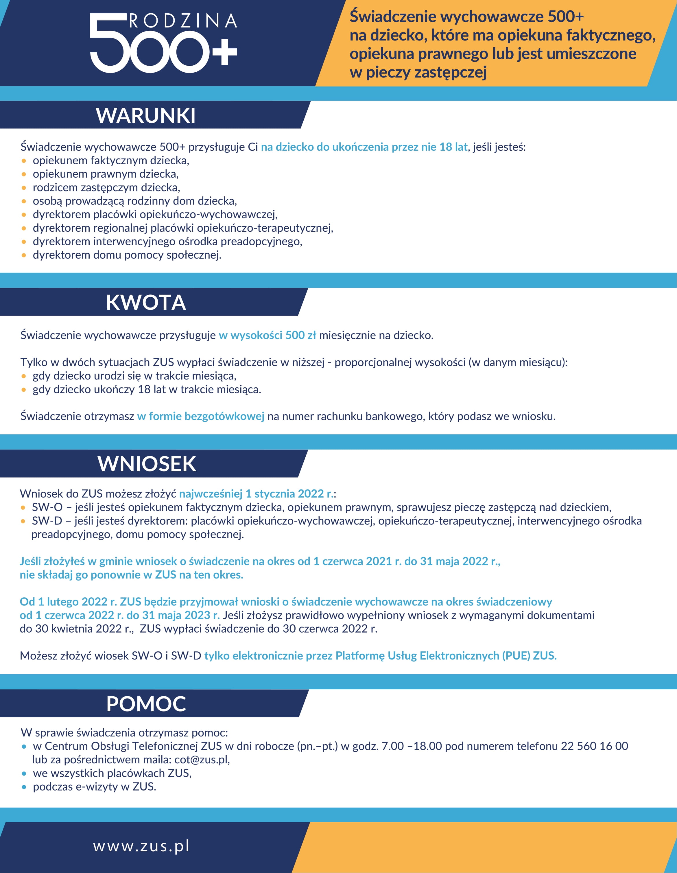 Od 1 stycznia 2022 r. to Zakład Ubezpieczeń Społecznych będzie przyjmował nowe wnioski o świadczenie 500+ i je realizował. Natomiast gminy będą kontynuowały wypłaty już przyznanych świadczeń do końca maja 2022 r. Nie trzeba w tych sprawach składać nowych wniosków.