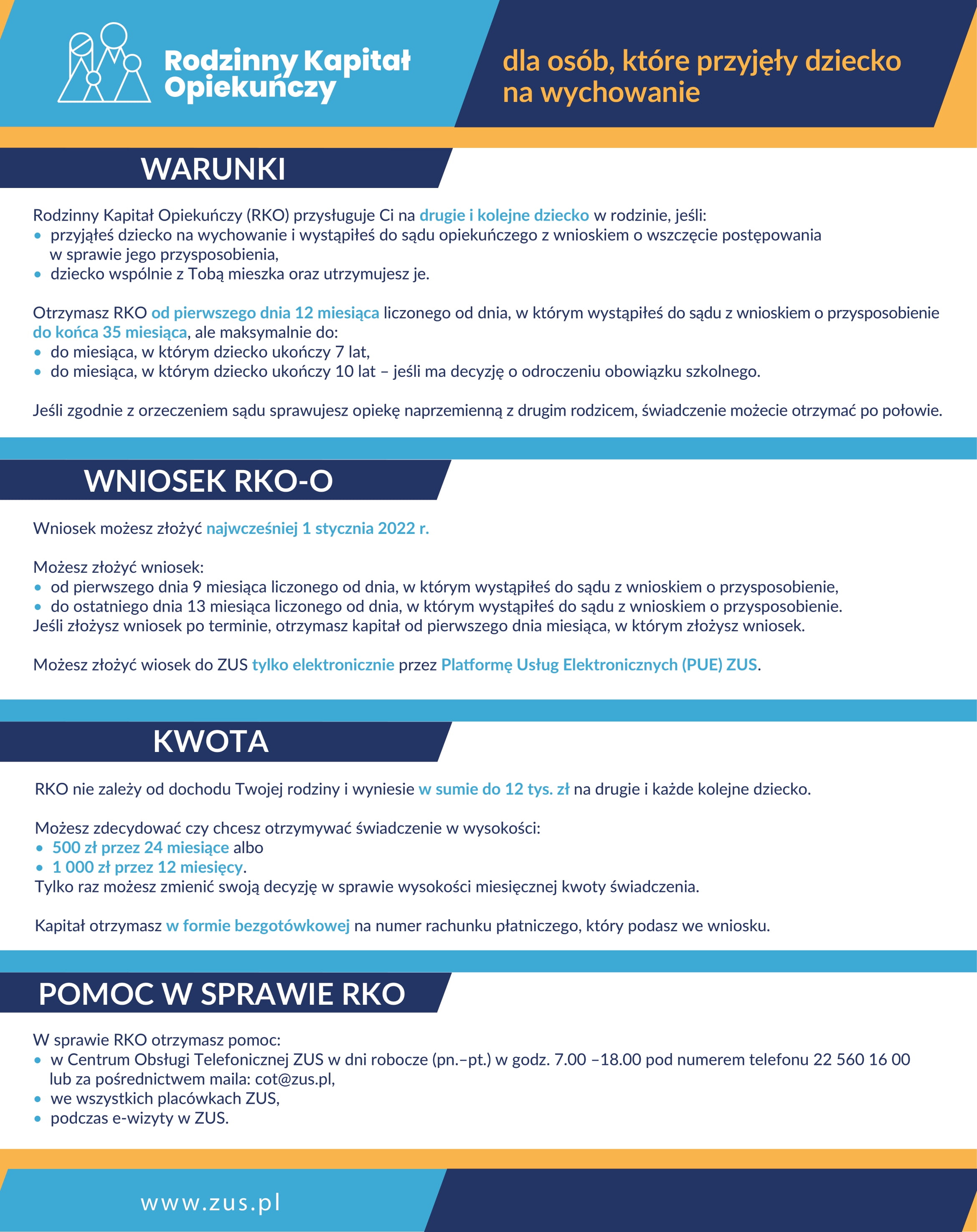 Od nowego roku na drugie i każde kolejne dziecko w rodzinie w wieku od 12. do 35. miesiąca życia, będzie przysługiwało nowe, dodatkowe wsparcie – Rodzinny Kapitał Opiekuńczy (RKO). Świadczenie będzie realizował Zakład Ubezpieczeń Społecznych.