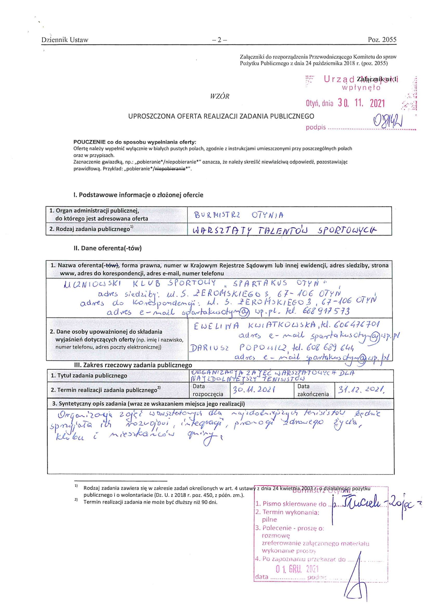 Powyższe dokumenty należy dostarczyć do Urzędu Miejskiego w Otyniu, ul. Rynek 1, pokój nr 4 do dnia 13 grudnia 2021 r. do godziny 16.00.
