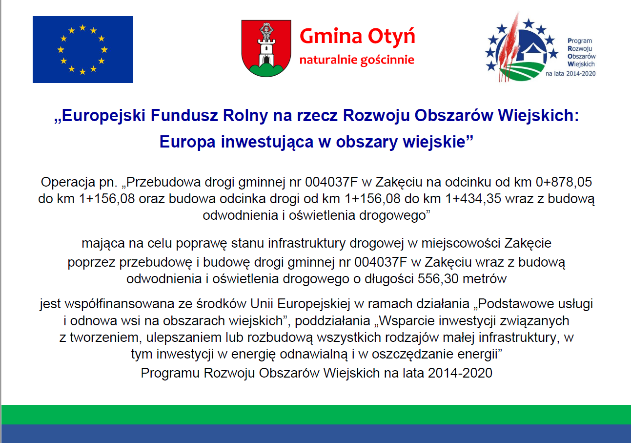 Operacja pn. „Przebudowa drogi gminnej nr 004037F w Zakęciu na odcinku od km 0+878,05 do km 1+156,08 oraz budowa odcinka drogi od km 1+156,08 do km 1+434,35 wraz z budową odwodnienia i oświetlenia drogowego” mająca na celu poprawę stanu infrastruktury drogowej w miejscowości Zakęcie poprzez przebudowę i budowę drogi gminnej nr 004037F w Zakęciu wraz z budową odwodnienia i oświetlenia drogowego o długości 556,30 metrów jest współfinansowana ze środków Unii Europejskiej w ramach działania „Podstawowe usługi i odnowa wsi na obszarach wiejskich”, poddziałania „Wsparcie inwestycji związanych z tworzeniem, ulepszaniem lub rozbudową wszystkich rodzajów małej infrastruktury, w tym inwestycji w energię odnawialną i w oszczędzanie energii” Programu Rozwoju Obszarów Wiejskich na lata 2014-2020.