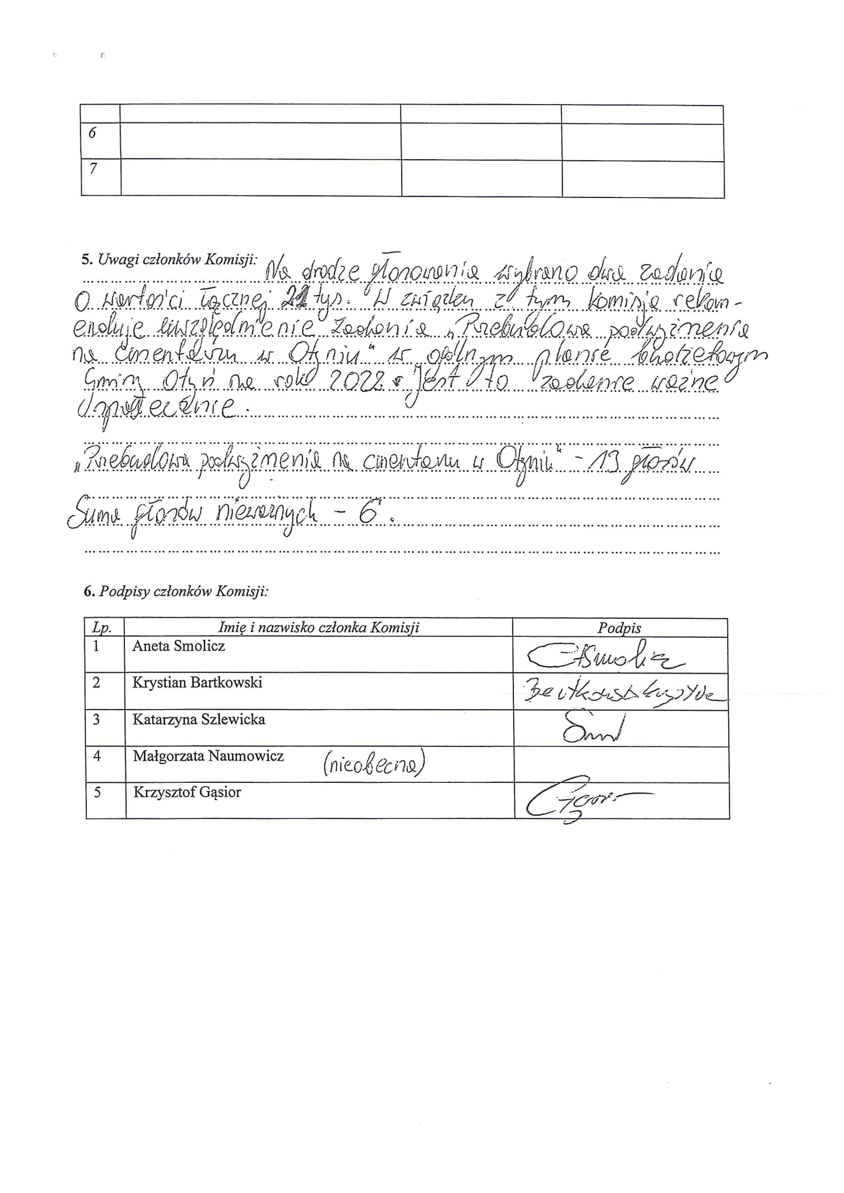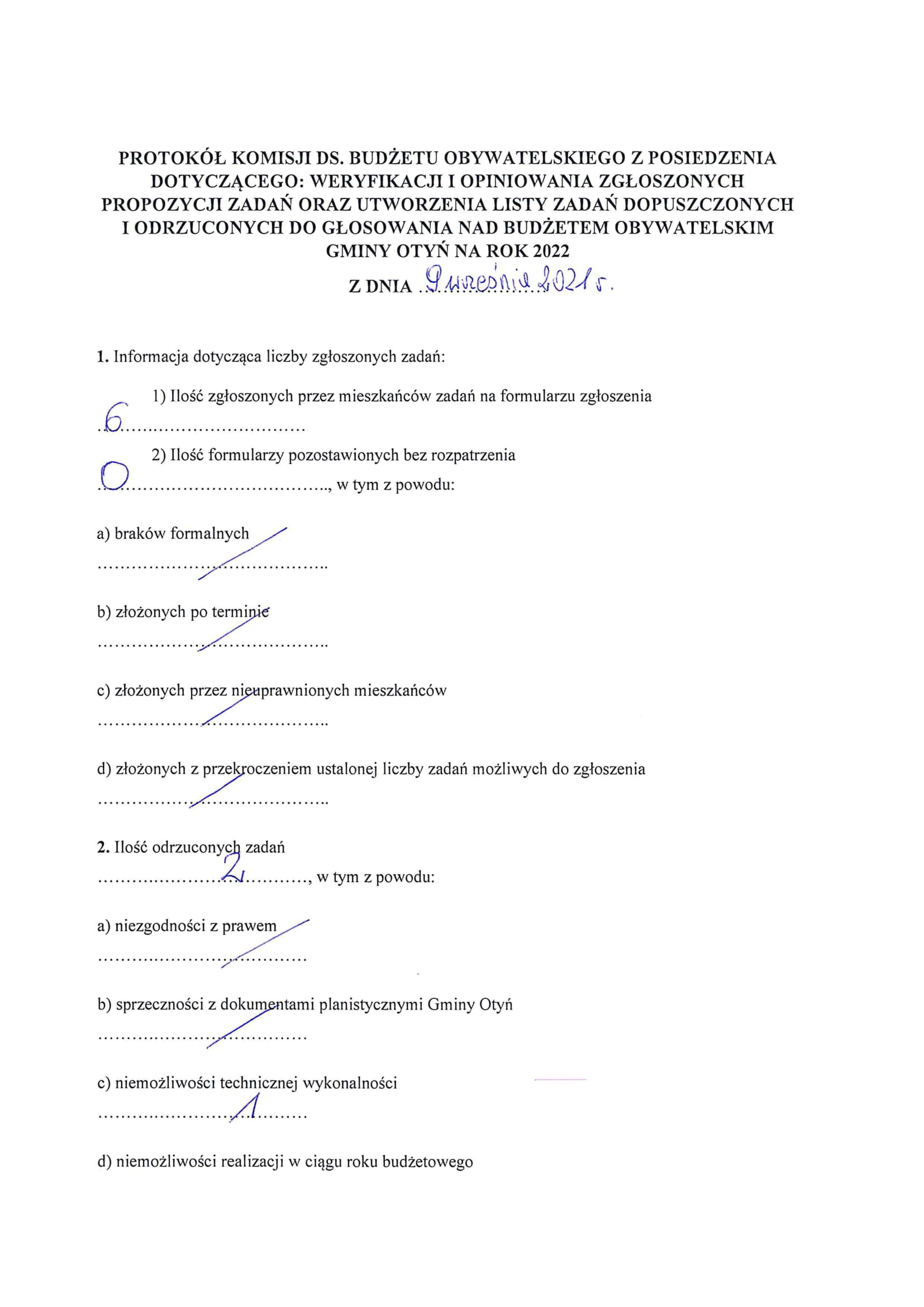 Protokół komisji ds. budżetu obywatelskiego z posiedzenia dotyczącego: weryfikacji i opiniowania zgłoszonych propozycji zadań oraz utworzenia listy zadań dopuszczonych i odrzuconych do głosowania nad budżetem obywatelskim gminy otyń na rok 2022.