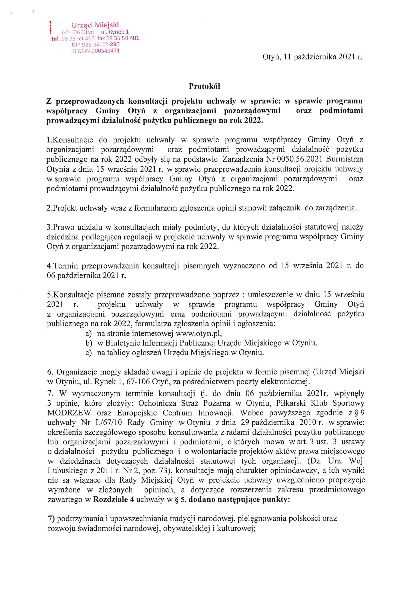 Protokół z przeprowadzenia konsultacji projektu uchwały ws. programu współpracy Gminy Otyń z org. pozarządowymi