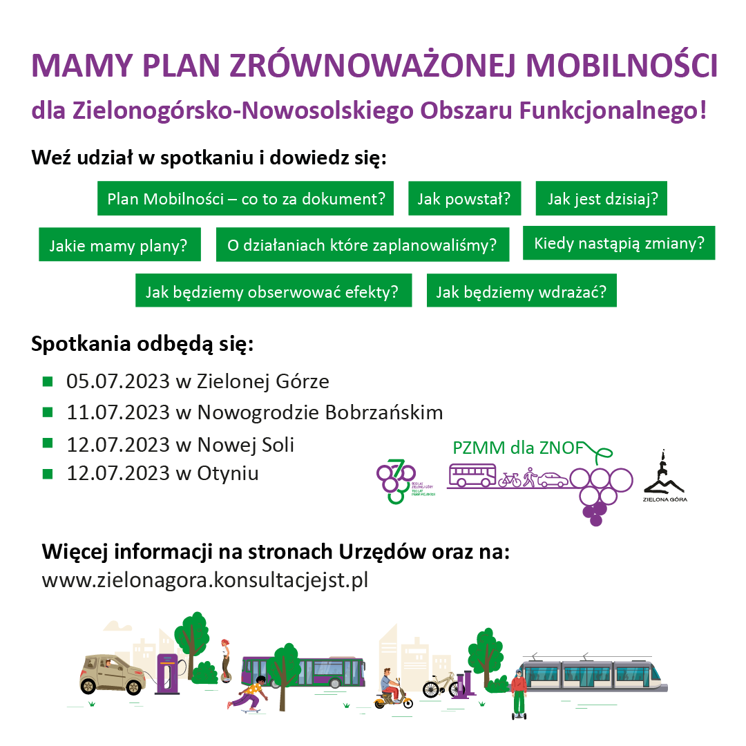 Projekt Planu Zrównoważonej Mobilności Miejskiej dla Zielonogórsko-Nowosolskiego Obszaru Funkcjonalnego (ZNOF) jest już gotowy. Zapraszamy wszystkich mieszkańców i innych interesariuszy do zgłaszania uwag do dokumentu