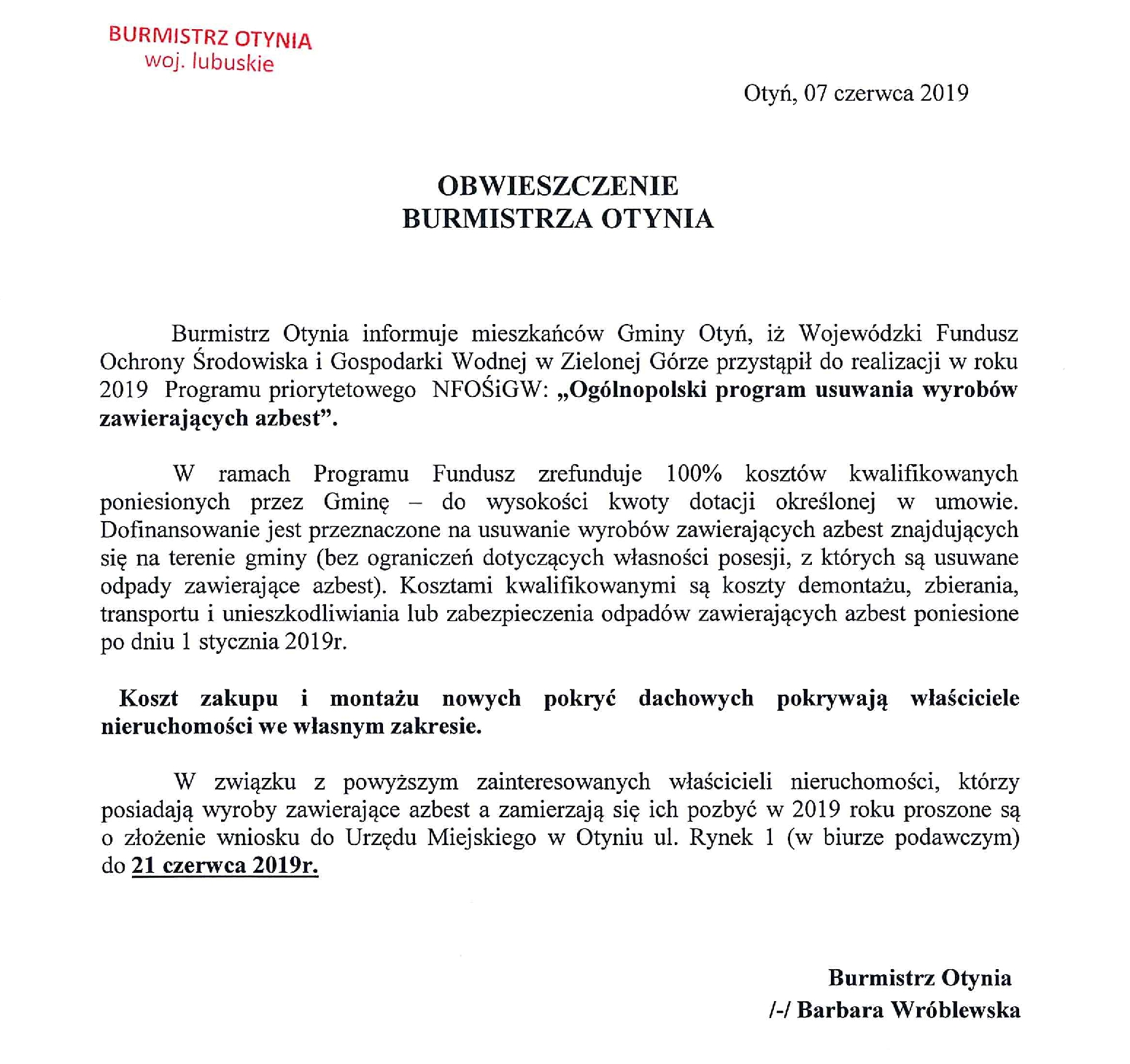 OBWIESZCZENIE BURMISTRZA OTYNIA W SPRAWIE AZBESTU